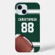A cool sports jersey style design in green with white stripes and customizable text in white for their name and number. A football is also featured as part of the design. Ideal for the football player, grid iron fan or football coach. Made in part from graphic licensed and © Graphics Factory.com