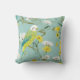 Beautiful bird lovers throw pillow featuring a green and yellow budgerigar with yellow and white flowers on a soft teal background.