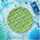 This party paper plate features squares in different shades of green and yellow in a pixelated pattern resembling 16 bit graphics in popular video games.