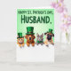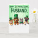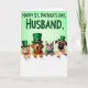 This greeting card shows four young animal friends peeking over a wide white ledge, set against a smooth gradient background of leafy greens 💚. Across the top, centered near the upper edge, the message “HAPPY ST. PATRICK’S DAY, HUSBAND.” appears in large emerald-green letters that stand out clearly. On the far left, an amber-colored kitten with bright blue eyes wears a tiny green top hat with a small golden buckle, its paws resting lightly on the ledge as if leaning in close. Beside it, a caramel-toned puppy with big dark eyes wears a taller green top hat, angled slightly as though it’s nudging closer to the group like a loyal companion. Next comes a silver-striped kitten with yellow-green eyes and a green bow tie, holding a gentle, affectionate gaze toward its neighbors ☘️. On the far right, a fawn-colored, short-snouted puppy with a wrinkled little face wears another small green top hat, adding a cozy, friendly closeness to the lineup. The hats and bow tie are all bright green accents against the soft fur textures and the crisp white ledge.