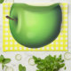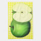 Kitchen towel with image of green apples against a yellow checked background.