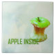 Photo of a big green apple against red background. The apple is eaten out, only the core is left. Text Apple inside is added. It means that the apple is inside the eater.