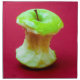 Photo of a big green apple against red background. The apple is eaten out, only the core is left.