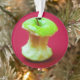 Photo of a big green apple against red background. The apple is eaten out, only the core is left.