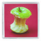 Photo of a big green apple against red background. The apple is eaten out, only the core is left.