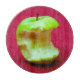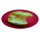 Photo of a big green apple against red background. The big bite has been taken out of the apple.