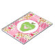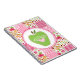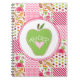A notebook for teachers featuring an illustration of a green apple decorated with a pink heart and white text "TEACHER." Background is a girly patchwork inspired design consisting of polka dot, paisley, stripes, zigzag, floral, and gingham patterns.