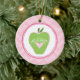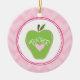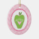 An ornament for teachers featuring an illustration of a green apple decorated with a pink heart and white text "TEACHER." Background is pink zigzag on pink.