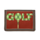 Traditional golfing argyle (argyll) diamond pattern golf plaid wallet reads Golf. Perfect to keep a little loose money with your golf clubs. Designed by Sarah Trett.