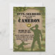 This custom party invitation features a military mission theme. Images of green army men toy soldiers are printed at the bottom, with one in a parachute at the top. A camouflaged pattern borders the images.