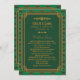 These wedding programs feature a emerald green and gold color palette, a geometric frame, geometric patterns, and other stylistic details all inspired by Art Deco and the roaring twenties. You can customize the sample text fields to your liking.