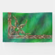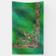 An abstract work in bright green and copper. A clear green gem is surrounded by copper-edged blades of grass accented with sparkling emeralds and orange starbursts. The waving, curving fractals in the background appear in deeper green, brown, and orange inside the copper filigree of the leaf motif.