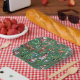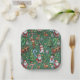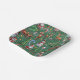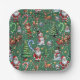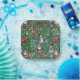 Christmas-themed pattern featuring Santa Claus, reindeer, snowmen, elves, Christmas trees, candy canes, and snowflakes on a green background