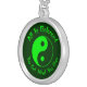 All Is Balanced - You Get What You Give - sterling silver charm necklace with bright green lettering and yin yang symbol on a dark green background.