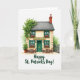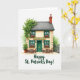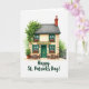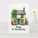 This greeting card shows a two-story Irish “Green Bar” painted on a bright white background, with cream walls and emerald green window frames and front door that feel ready for St. Patrick’s Day ☘️. A golden sign reading “Green Bar” sits above the entrance, drawing your eye like a friendly invitation to step closer. Ivy trails down one side of the building, and a potted plant below echoes that fresh green touch 💚. Four windows line the front, each with a window box spilling reddish-pink flowers that add a cozy, cared-for look. Two small wooden tables with pairs of chairs wait outside, set up like a sweet spot for close friends to lean in and share a quiet laugh. Near the bottom of the design, “Happy St. Patrick’s Day!” appears in a dark green, flowing style, centered beneath the building. The grey slate roof is topped with a rustic brick chimney, and the edges of the painting stay soft like watercolor washes.