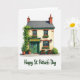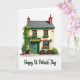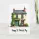 This card shows a cozy two-story Irish pub scene where friends could easily linger close, sharing quiet laughs under the soft light 💚. The building has a creamy facade with emerald green trim around the windows and a matching double door that feels welcoming and familiar. Above the entrance, a bright yellow sign reads “GREEN BAR” in clear lettering, drawing your eye straight to the doorway. A dark slate roof sits on top with two red brick chimneys, giving the place an old-world look that suits a St. Patrick’s Day outing. Thick green ivy tumbles down the left side, and window boxes on both floors hold clusters of red flowers that add a warm, affectionate contrast to all the green ☘️. In front, two rustic wooden tables with benches sit on a paved area, set up for pairs to lean in and talk over a drink. Along the bottom edge, “Happy St. Patrick’s Day” appears in dark green lettering, neatly placed against the white background. The scene is framed by that white backdrop, with the ivy leaves, window trim, brick chimneys, and red blooms all sharply defined.
