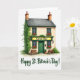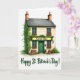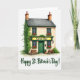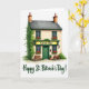 Designed with a cozy Irish pub scene, this card shows a two-story building labeled “Green Bar” centered against a white background, where the open doorway and glowing windows suggest friends lingering close and sharing quiet laughs. Deep green walls and darker emerald window frames set the main color theme, while ivy drapes down the left side like a trail of shamrock-shaped leaves ☘️. Red flowers overflow from window boxes on both floors, adding a striking contrast that feels like a sweet gift left for someone special. Two rustic wooden tables sit to either side of the entrance, angled as if a pair might pull up chairs and lean in for an easy conversation 💚. Warm terracotta chimneys top the roof, and gentle shading across the facade gives the building a sunlit, late-afternoon look. The message “Happy St. Patrick’s Day!” appears beneath the illustration in dark green lettering, centered and easy to read. Share St. Patrick’s Day sentiments with someone you care about, and let the green doorway, ivy, and red window-box flowers stand out crisply against the white space.
