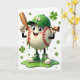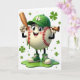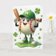 This greeting card shows an anthropomorphic baseball character centered on a white background, smiling wide with rosy cheeks and big eyes that seem to glance your way like a friendly teammate. It wears a green baseball cap marked with a four-leaf clover and matching green high-top sneakers, giving the scene a St. Patrick’s Day look 💚. Red baseball stitching curves across its round body while green liquid drips down the front, gathering into a glossy emerald puddle at its feet. In one gloved hand it holds a brown baseball bat, and in the other it raises a small horn, as if sounding a cheerful note for a friend standing nearby ☘️. Small shamrocks and scattered green dots float around the character, adding movement without crowding the open space. The greeting text sits near the top in green lettering, leaving the character as the main focus below. The cap’s clover emblem, the red stitches, and the green puddle stand out sharply against the white field.