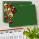 A green background. Personaiize and add a name and your return address. The name is written with a modern and trendy handlettered style script. Christmas decor, baubles in red and gold.