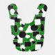This bib has a Bauhaus design of triangles, circles, rectangles, and pentagons in black and white on a field of green.