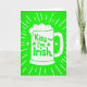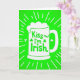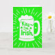 This card features a lime green background with a stylized white beer mug centered like the main attraction ☘️. A fluffy white cap of foam sits on top, and thin white rays spread outward, giving the scene a lively, sparkling feel. Inside the mug, the phrase “Kiss me! I’m Irish” appears in rounded green lettering, placed neatly in the middle as if it’s part of the drink label. The cheeky line reads like an invitation between friends—or a flirty nudge between two people leaning closer at a party 💚. Three shamrocks decorate the mug around the words, with two three-leaf clovers and one four-leaf clover tucked in like lucky little accents. The strong contrast between the white mug and the green field keeps everything easy to spot at a glance. White radiating lines frame the mug evenly, pointing back toward the foam and the green text inside.