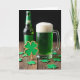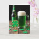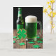 The front design shows a sturdy glass mug filled with emerald-green beer, topped with a thick white cap of foam, with tiny bubbles clinging to the inside like it was just poured. Slightly behind it sits a matching green bottle, softly out of focus so the mug feels like the main character in the scene. In the foreground, an upright three-leaf shamrock stands like a little companion beside the drink, edged with glittery gold that catches the light. A few flatter shamrock cutouts are scattered across a dark, rustic wooden surface, their close spacing suggesting a friendly gathering around the table ☘️. The background is deep black, making the greens stand out and giving the whole setup a cozy, evening feel. St. Patrick’s Day text appears near the top in bright green, balanced so it doesn’t crowd the artwork, with a smaller line beneath it in white for contrast 💚. Light glances off the smooth glass and the wood grain, and the shamrock’s gold outline sparkles against the shadowy backdrop.