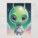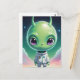 Green big head alien with horns postcard