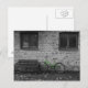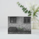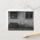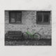 Postcard with a photo of a brick building with two windows and a little bench under one of the windows. Next to the bench is a bike. The photo is in black and white except for the bike, that is green. Customizable.