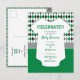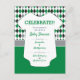 Oversized elegant argyle pattern in school colors of green and black set the backdrop for this cute baby shower design. A white baby bodysuit has all the text written on it for the big event, which can be a couples shower or just for mom. Design comes in maroon and gray, burnt orange and gray, red and black, green and black, orange and navy, green and yellow, and purple and gray. Matching products available.