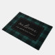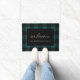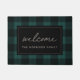 Add a farmhouse style touch to your entryway with this rustic buffalo plaid patterned doormat in green and black. "Welcome" appears in the center in casual handwritten script lettering; personalize with your family name beneath.