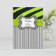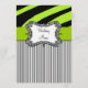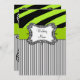 Black and Green Zebra Stripes Printed Wedding Menu Cards with green accents and black, grey and white striped pattern. A bold green, black and white fun wedding menu card for the reception tables with the bride and groom names and the wedding menu on the back of the card. Design by Elke Clarke © Graphics licensed.