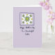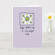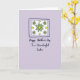 This greeting card features a pale lavender background with a crisp white rectangle centered near the top, outlined in deep indigo like a neat frame. Inside that frame, a six-petaled green flower with a sunny yellow center sits in the middle, surrounded by four smaller matching flowers that feel like close companions gathered in a gentle circle. Between the blossoms, four tiny yellow diamond shapes add a tidy, jewel-like sparkle that hints at a sweet bond ❤️. The smooth, defined outlines keep everything orderly while still letting the soft colors feel tender and affectionate. Below the framed floral panel, a flowing handwritten-style message in dark blue stretches across the lower half, placed as the main line of text. The contrast between the deep indigo lettering and the light lavender background makes the words easy to notice without overpowering the art 🌼. The framed panel is centered above the text, with even spacing around it and the floral shapes arranged symmetrically within the indigo border.