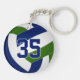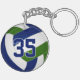 This team colors volleyball themed keychain for girls or boys features the realistic image of a volleyball that has green, blue and white panels, upon which you can customize the player's name and court position, plus school or club name and mascot name on the front and jersey number on the back - by katz_d_zynes