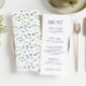 Amplify your wedding experience with these elegant watercolor rustic wedding menu cards, adorned with vibrant blue and yellow flower blooms and complemented by sophisticated navy blue text.