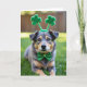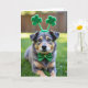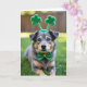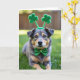 Designed with a medium-sized mixed-breed dog in the spotlight, this St. Patrick’s Day scene shows greys, tans, and deep browns across its coat as it rests on an emerald lawn. Its deep amber eyes catch tiny highlights, holding a steady, patient gaze that feels like it’s quietly sharing a secret with you 💚. Two fuzzy green shamrocks sit on a slim headband above its ears, adding a sweet, friendly touch that makes the dog look dressed up for someone special ☘️. A sparkling green bow tie dotted with little gold flecks wraps neatly at the neck, echoing the festive theme without stealing attention from the face. Behind the dog, the background fades into soft, out-of-focus greens and warm browns, like a park blurred into gentle color. The main greeting text sits near the top in bright green, with a smaller line placed near the bottom in a lighter green that stays easy to read. Natural light falls across the fur and the bow tie, leaving a soft glimmer on the glitter and a smooth sheen on the grass blades.