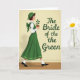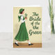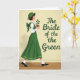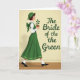 This design shows a retro-styled woman striding across a warm cream background, her profile filling the left side as her skirt swings forward with gentle motion 💚. She’s dressed in deep emerald green—a full, sweeping dress with a matching cloche hat—and a large bow gathers at the back like a quiet flourish. A crisp white ruffled blouse peeks out at the neckline and cuffs, softening the strong green with a light, romantic touch. Her auburn bob and red lips give her a classic look, and her steady gaze feels like she’s walking toward someone she trusts. In both hands she carries a small sapling in a terracotta pot ☘️, held close as if it’s a gift meant for a dear friend. Soft, diffused light lays mild shadows along the folds of the dress, adding depth without harsh contrast. On the right side, the title “The Bride of the the Green” appears in flowing green lettering, balanced against the open cream space.