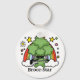 A funny keychain for your favourite brocc I mean rock star. A cute green cartoon drawing of a broccoli holding an electric guitar and wearing shades looking cool standing in front of a bright colourful rainbow and fluffy white clouds. Below the illustration in black lettering are the words Brocc Star a fun broccoli pun.