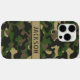 Customize this multi-hued green and brown camouflage iPhone 16 pro max case with your name in a trendy modern CAP font in brown on khaki. It's masculine and perfect for your favorite military, hunting, country or outdoorsman!