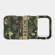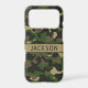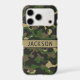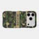 Customize this multi-hued green and brown camouflage iPhone 17 pro case with your name in a trendy modern CAP font in brown on khaki. It's masculine and perfect for your favorite military, hunting, country or outdoorsman!