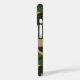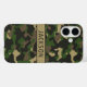 Customize this multi-hued green and brown camouflage iPhone 16 case with your your name in a trendy modern CAP font in brown on khaki. It's masculine and perfect for your favorite military, hunting, country or outdoorsman!