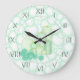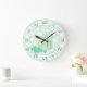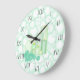 A relaxing green bathroom clock with lit candles in shades of green, bath pearls, silver coloured roman numerals on a bubbly green background. artwork©Delightful-Doodles