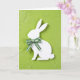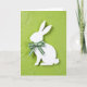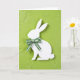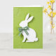 This card features a smooth white silhouette of a seated bunny 🐰 centered against a bright lime-green background, creating a sweet, close-to-the-heart contrast. The bunny’s simple shape feels calm and affectionate, like it’s pausing quietly for someone special. Around it, the green surface has raised floral and leafy patterns, with small daisy-like blooms that add gentle texture and soft shadow. A neatly tied bow sits at the bunny’s neck, made from a small green-and-white checkered ribbon that adds a cozy, friendly touch 🐇. The lighting is bright and even, making the white figure look crisp while the textured greenery appears softly layered. There is no main character scene beyond the bunny itself, so the focus stays on the tender, springlike mood created by the colors and textures. Any text would sit best near the top or bottom in a simple white or pale green tone so it doesn’t compete with the centerpiece. The background shows embossed leaves and tiny flower shapes scattered across the lime-green surface.
