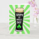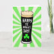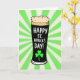 This design shows a stylized pint glass centered on the card, filled with deep, inky-black stout and topped with a thick, creamy tan foam that curls in soft rounded shapes. Behind it, a radial burst of alternating bright green and warm off-white rays spreads outward, like a spotlight on a shared toast with someone close 💚. Along the right curve of the glass, white hand-drawn lettering runs vertically in stacked lines reading “HAPPY ST. PATRICK’S DAY!” and it guides your eyes upward in a light, friendly way. Near the base, a small emerald shamrock sits like a quiet little “I’m thinking of you” tucked into the celebration ☘️. The contrast between the dark drink and the pale foam makes the glass feel inviting, as if two friends just leaned in to clink pints and grin. The rays in the background add motion and energy, framing the glass as the clear focal point without crowding it. The green shamrock stands out crisply against the lighter background near the bottom edge of the glass.