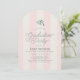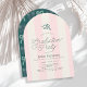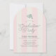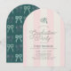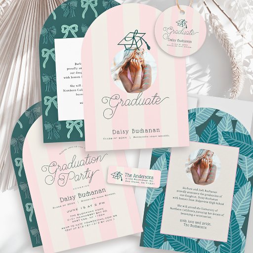 This preppy and coquette graduation party invitation features a green graduation cap on a cream background with light pink stripes. The reverse side features a dark green background with a green bow pattern. Personalize it for your needs. You can find matching products at my store.