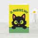 This card features a stylized black cat peeking up from the bottom edge, its front paws resting on a wide emerald-green panel that fills the lower third. Behind it, a bright yellow background covers the upper two-thirds, making the cat’s dark shape stand out sharply. The cat’s oversized eyes have yellow irises and green pupils with tiny white highlights, giving it a wide-eyed look that feels like it’s locking eyes with a close friend 💚. A small pink tongue shows at the center of its mouth, adding a teasing, affectionate touch. Across the top, the words “ST. PATRICK’S DAY” curve in a deep green sans-serif font, arched above the cat’s head. The fur edge is slightly jagged, suggesting softness while keeping the design graphic and simple ☘️. The final image is framed by the strong contrast of black, emerald green, and sunny yellow, with the cat centered under the curved headline.