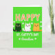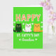 This card features a bright green background that nods to Ireland, with “HAPPY” placed at the top in orange letters edged by a wavy white outline 💚. Below the headline, three stylized cats sit side by side like close friends posing for a photo: a black cat with wide yellow eyes, a white cat with small green spots and green eyes, and a ginger cat with an easy, content look. Their calm faces and snug spacing give the scene a cozy, affectionate feel, like they’re sharing the moment together. Centered beneath the cats, “ST. CATTY’S DAY” appears in white, standing out sharply against the green field. Near the lower area, the word “Grandson” is written in a flowing black style, with tiny white shamrocks on either side to frame it ☘️. Small shamrocks are scattered around the design, adding little bursts of white that keep your eye moving. The overall look stays flat and graphic, with the orange “HAPPY,” white outlines, and the trio of cats clearly arranged in a neat vertical stack.