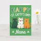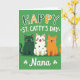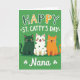 This card shows three friendly cats lined up front and center on an emerald green background, their wide smiles and soft pink blush giving them a sweet, affectionate look toward each other 💚. One cat is deep green, the next is white with green spots, and the third is a warm tangerine color, creating a cozy trio that feels like close friends celebrating together. Their bright, rounded eyes add to the gentle, cheerful mood, as if they’re sharing an inside joke. Across the top, the phrase “HAPPY ST. CATTY’S DAY” sits in large white lettering, with a few letters in “HAPPY” accented in orange for contrast. Small white shamrocks sit near the headline and also appear lower on the design, adding a simple holiday touch ☘️. Near the bottom, the name “Nana” appears in white text, tucked in close to the lower area like a quiet sign-off. Soft shadows and slight texture run through the cats and lettering, and white shamrock shapes frame the text against the rich green backdrop.