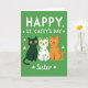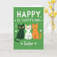 Designed with a rich emerald-green background, this St. Patrick’s Day card features three stylized cats lined up side by side, giving each other the kind of easy, friendly closeness that feels like a sisterly inside joke 💚. On the left is a sleek dark green cat with wide yellow eyes, followed by a white cat dotted with lime-green spots, and then an orange tabby with soft stripes, all wearing matching small smiles. Scattered across the green field are tiny white shamrock shapes that float like confetti ☘️. Across the top, the phrase “HAPPY ST. CATTY’S DAY” appears in large white lettering, centered and easy to read against the dark background. Beneath the cats, the word “Sister” is written in a flowing style in white, placed low and centered under the trio. The flat, vector-like look keeps the shapes simple and the colors solid, with no heavy shading. The cats’ round eyes, curved mouths, and the repeating shamrocks stand out crisply against the deep green backdrop.