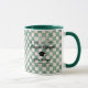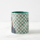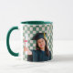 Personalized portrait mug for a graduation with a green checkered pattern on the background and the class, the graduate's name, degree, university name, and a grad cap design on the back. To create a cut-out, crop your image to the desired subject and use the "remove background" tool.