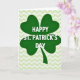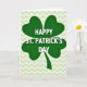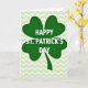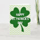 This card shows a large four-leaf clover centered on the front, colored a deep leafy green that draws your eyes in right away 💚. Each heart-shaped leaf spreads evenly, giving the clover a gentle, welcoming look that feels like an invitation to stand close and celebrate together. Across the clover, white sans-serif text reads “HAPPY ST. PATRICK’S DAY,” arranged in stacked lines so the words sit neatly within the leaves. The bright white lettering contrasts strongly against the dark green, making the message easy to read at a glance. Behind the clover, a repeating chevron pattern in soft pastel green and white adds texture, like a festive backdrop without stealing attention. The mix of rich green and pale pattern creates a cozy, friendly mood, like two friends sharing a smile over a little bit of luck ☘️. The centered clover remains the main focus, with the chevrons forming a tidy, angled border-like field around it. The background chevrons alternate light green and white in evenly spaced zigzags across the entire card front.